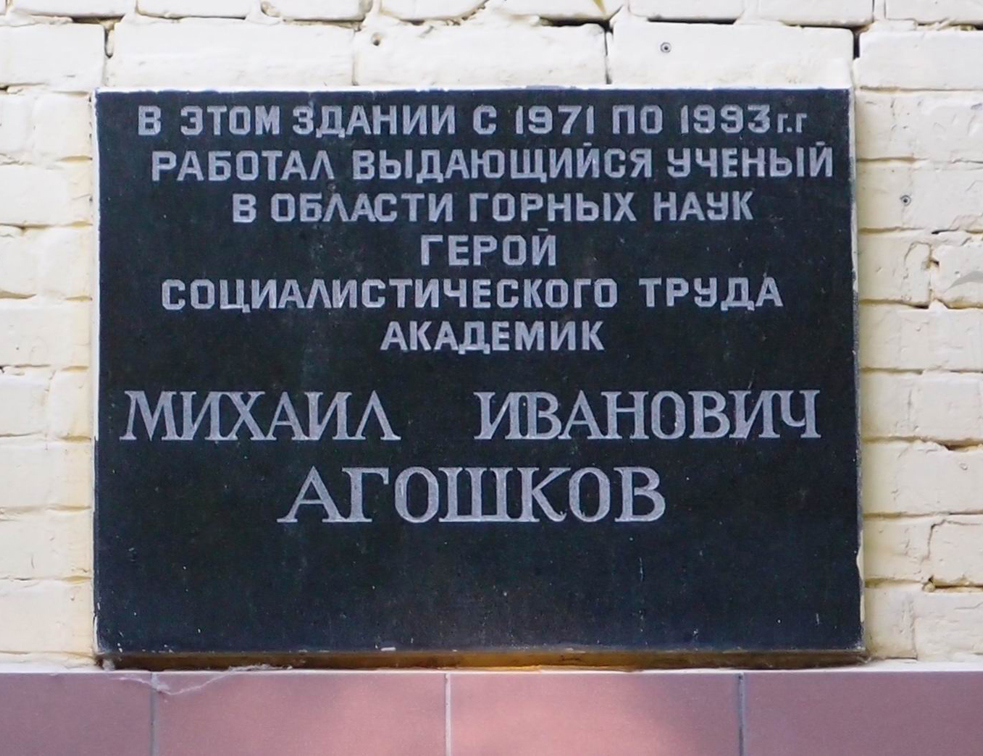 Установлена в Москве (Крюковский тупик, дом 4) на здании Института проблем комплексного освоения недр, в котором в 1971-1993 годах работал М.И.Агошков. Фото Станислава Лебедева, 20.06.2013.