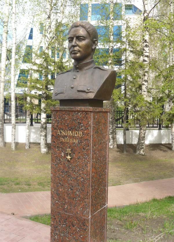 Бюст на Аллее славы в Парке Победы города Ханты-Мансийска. 9 мая 2005 года бюст Тулебаю Ажимову открыт в Сургуте.