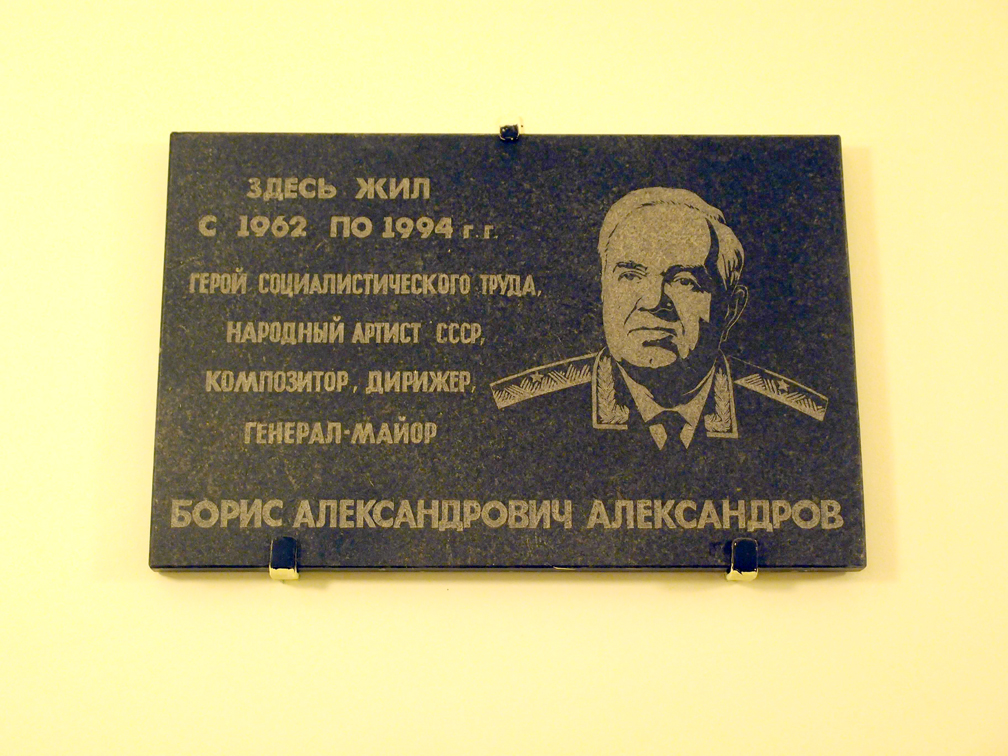 Установлена в Москве (улица Серафимовича, дом 2, подъезд 12) на доме, в котором в 1962-1994 годах жил Б.А.Александров. Открыта 21 июня 1997 года. Фото Станислава Лебедева, 21.11.2014.