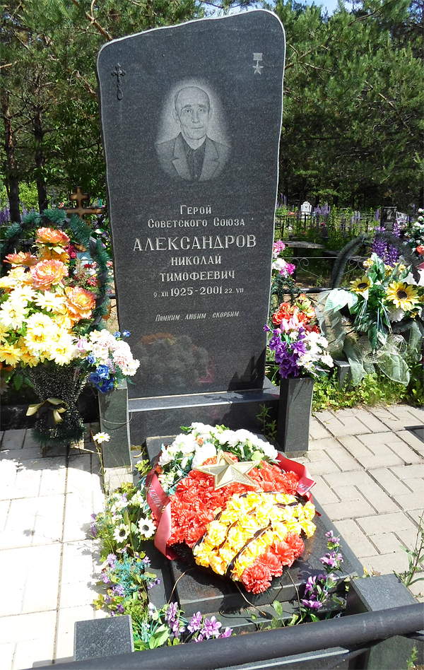Указом Президиума Верховного Совета СССР от 10 апреля 1945 года за ообразцовое выполнение боевых заданий на фронте борьбы с немецкими захватчиками и проявленные при этом отвагу и геройство гвардии сержанту Александрову Николаю Тимофеевичу присвоено звание Героя Советского Союза с вручением ордена Ленина и медали "Золотая Звезда" (N 8920).