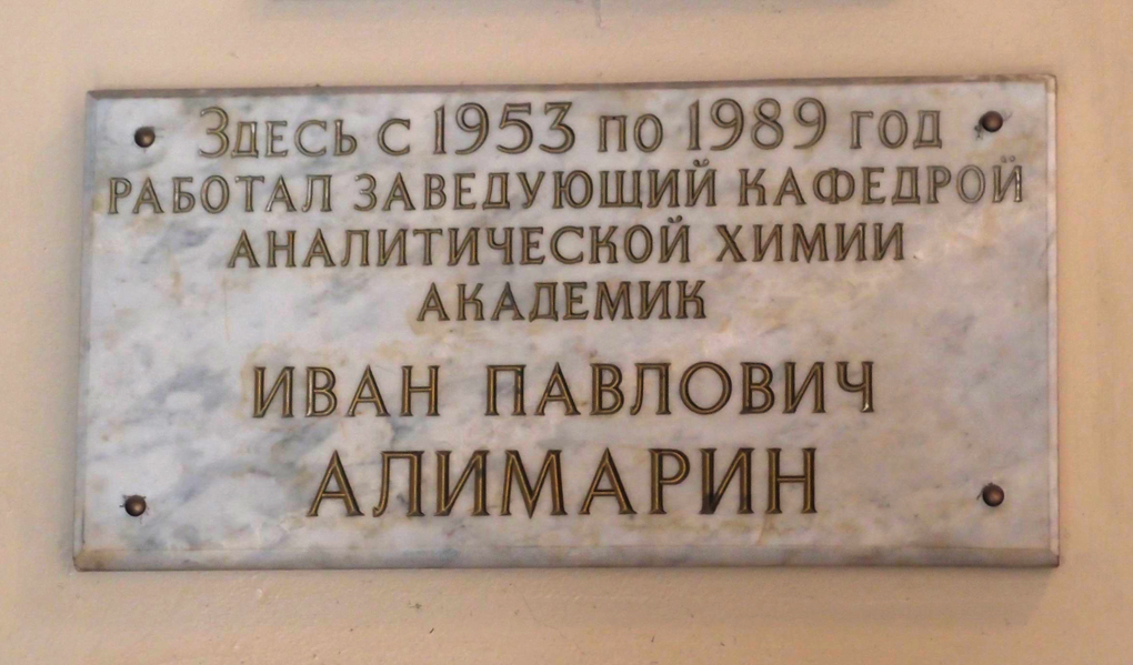 Алимарин Иван Павлович - учёный в области химии, главный научный сотрудник Института геохимии и аналитической химии имени В.И. Вернадского Академии наук СССР, заведующий кафедрой аналитической химии Московского государственного университета имени М.В. Ломоносова, академик Академии наук СССР.