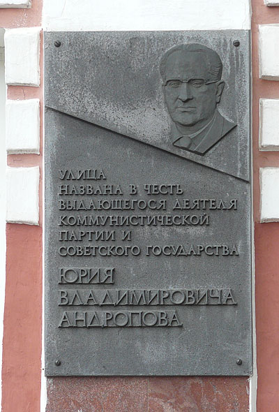 На родине Героя – станции Нагутская – установлен бюст Ю.В.Андропова, а в столице Карелии городе Петрозаводске – памятник, так же бюст утсановлен в городе Владимире. Его имя с 1984 по 1989 год носил город Рыбинск, Крусавский район Ставропольского края был переименован в Андроповский, каким остается и до настоящего времени. Улицы Андропова есть в Ярославле, Петрозаводске и других городах. Его имя было присвоено целому ряду предприятий, организаций, школ и воинских частей. Имя Ю.В. Андропова носит 4-я гвардейская танковая Кантемировская дивизия (в 2009-2013 годах - танковая бригада). В 1984-1992 годы, вплоть до своего расформирования, имя Андропова носило Ленинградское высшее военно-политическое училище ПВО (ЛВВПУ ПВО). В 1984-1991 годах имя Андропова носил Краснознамённый институт КГБ СССР, ныне Академия внешней разведки (АВР).