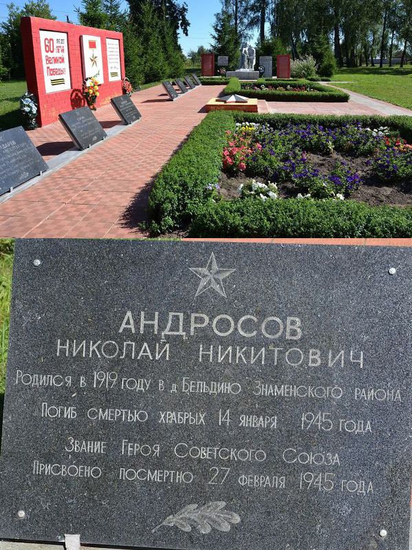 В селе Ждимир Знаменского района Орловской области установлен бюст Героя, в городе Орёл на здании средней школы №3, в которой учился Н.Н.Андросов, – мемориальная доска.