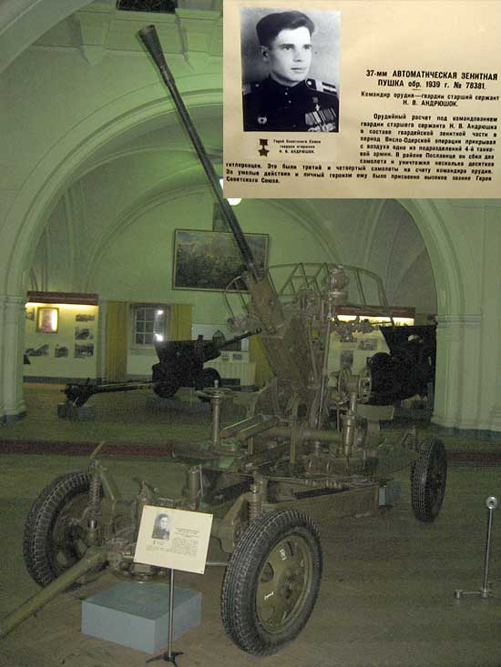 Наводчик орудия 1995-го зенитного артиллерийского полка (68-я зенитная артиллерийская дивизия, 4-я танковая армия, 1-й Украинский фронт) комсомолец сержант Николай Андрюшок особо отличился в боях на территории Польши.