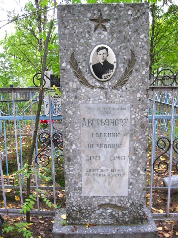 Аверьянов Евгений Петрович - командир минометного расчета 232-го минометного полка (12-я артиллерийская дивизия прорыва, 69-я армия, 1-й Белорусский фронт) сержант - на момент представления к награждению орденом Славы 1-й степени.