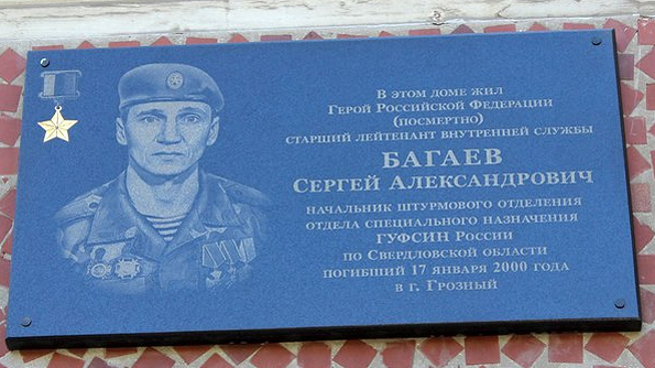 Мемориальная доска Герою Российской Федерации С.А. Багаеву. Установлена на здании Военно-исторического музея Военно-морского флота в Екатеринбурге в 2013 году.