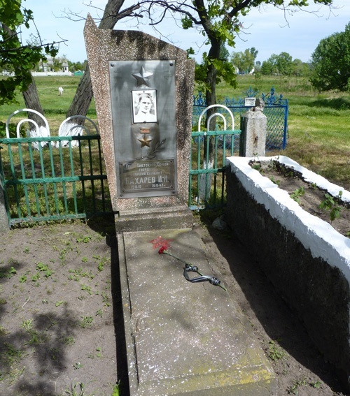 Во второй половине дня гитлеровцы бросили в бой танки. Часть из них прорвалась в расположение полка. Противотанковой гранатой Бахарев разорвал гусеницу "тигра" и готовился добить его, но в момент броска следующей гранаты был сражен вражеской пулеметной очередью.