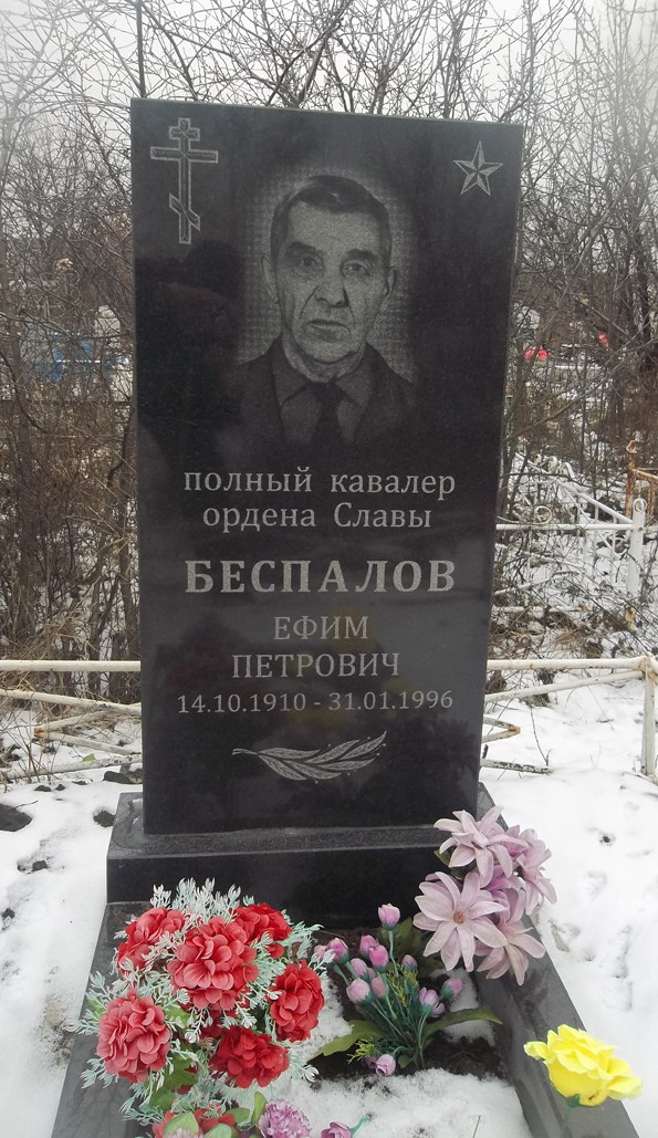 Беспалов Ефим Петрович – командир орудия 45-мм пушки 364-го стрелкового полка (139-я стрелковая дивизия, 49-я армия, 2-й Белорусский фронт) старший сержант – на момент представления к награждению орденом Славы 1-й степени.