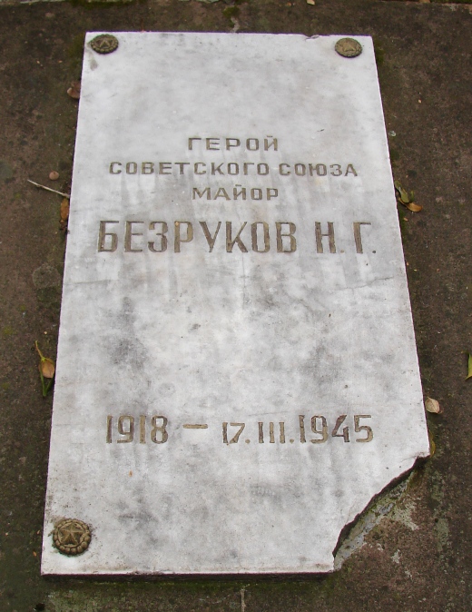С воинскими почестями погибшего комбата похоронили в городе Львове, на Лычаковском кладбище. После войны останки Николая Григорьевича Безрукова торжественно перезахоронили на Холме Славы, мемориальном комплексе на Воинском кладбище.