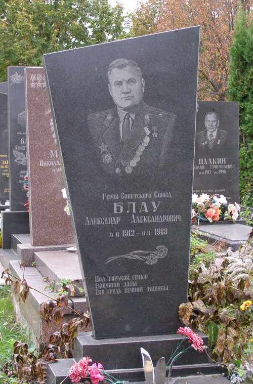С 1945 года майор А.А. Блау — в отставке. Работал в органах Министерства внутренних дел Кемеровской области. Жил в Чернигове. Скончался 11 февраля 1988 года. Похоронен на Яцевском кладбище города Чернигова.