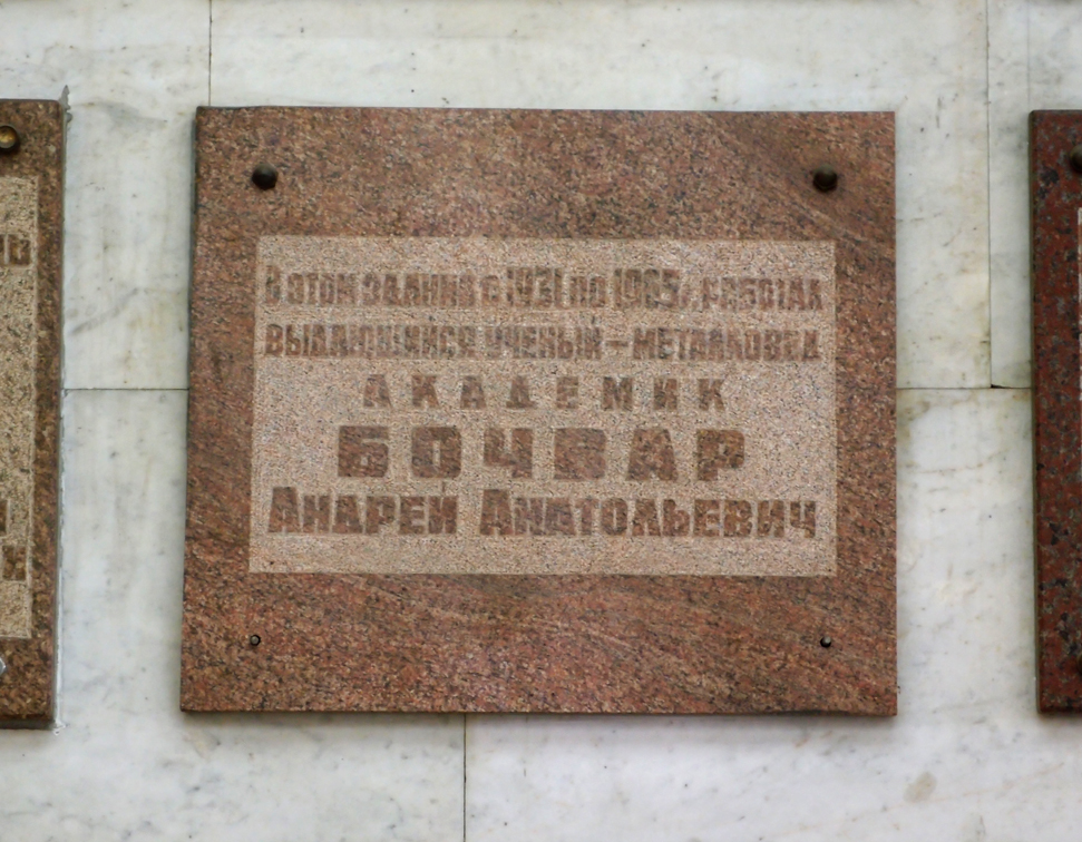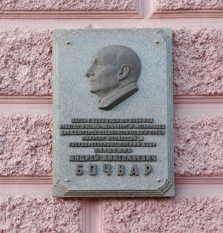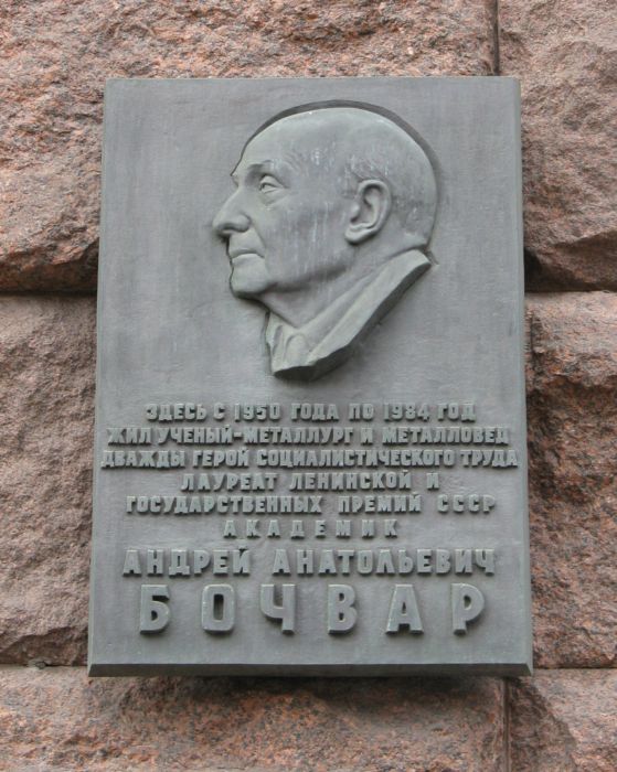 Бочвар Андрей Анатольевич – выдающийся советский учёный, специалист в области металловедения, доктор технических наук, профессор, академик АН СССР, директор Всесоюзного научно-исследовательского института неорганических материалов АН СССР.
