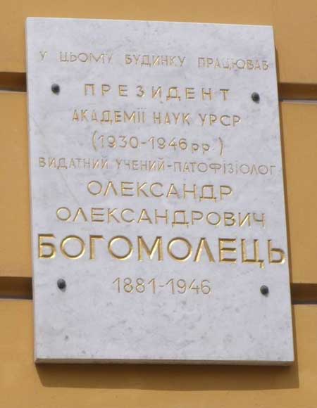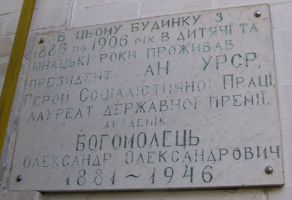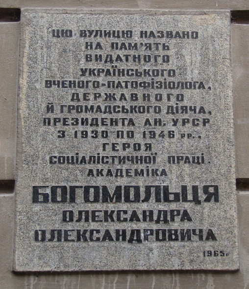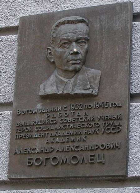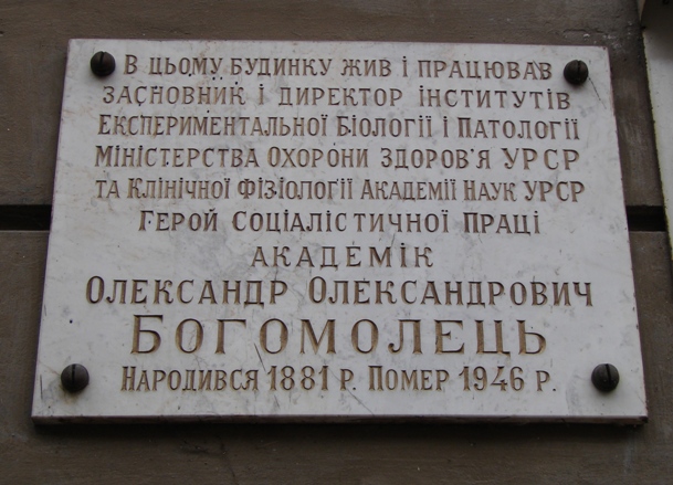 Богомолец Александр Александрович - патофизиолог, вице-президент Академии наук СССР, Президент Академии наук Украинской ССР, директор Института экспериментальной биологии и патологии Академии наук Украинской ССР, директор Института клинической физиологии Академии наук Украинской ССР, академик Академии медицинских наук СССР, академик Академий наук СССР, Украинской ССР и Белорусской ССР.