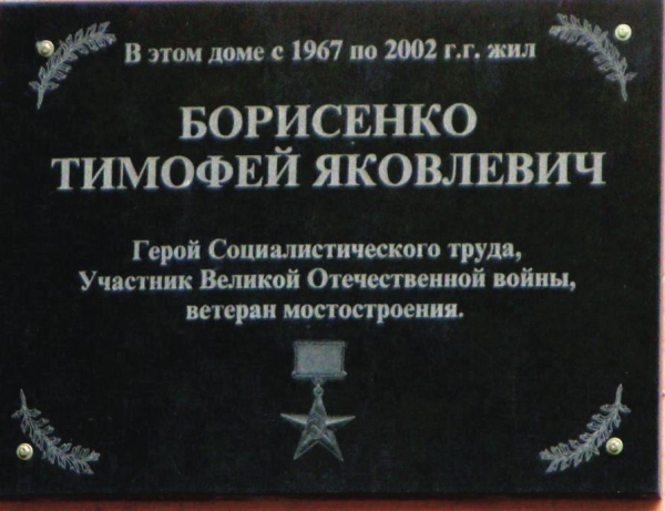 Указом Президиума Верховного Совета СССР от 28 июля 1966 года за выдающиеся успехи, достигнутые в выполнении заданий семилетнего плана по транспортному строительству, Борисенко Тимофею Яковлевичу присвоено звание Героя Социалистического Труда с вручением ордена Ленин а и золотой медали «Серп и Молот».