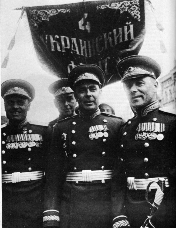 На Параде Победы на Красной площади в Москве 24 июня 1945 года генерал-майор Брежнев Л.И. принимал участие в качестве комиссара сводного полка 4-го Украинского фронта (командир сводного полка - гвардии генерал-лейтенант, Герой Советского Союза А.Л. Бондарев). Первоначально продолжал службу в Красной Армии: начальник политуправления Прикарпатского военного округа (9.07.1945-18.07.1946). 18 июля 1946 года уволен в запас.