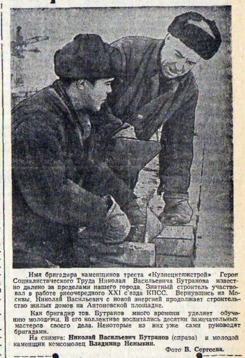 Бутранов Николай Васильевич — бригадир комплексной бригады каменщиков строительного управления «Гражданстрой» треста «Кузнецктяжстрой» Кемеровского совнархоза.