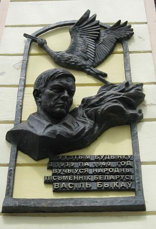 Установлена в городе Витебск (Белоруссия) на здании детской художественной школы №1 (улица Суворова, дом 3). Ранее здесь было Витебское художественное училище, в котором в 1939-1940 годах учился В.В.Быков. Открыта 25 сентября 2008 года. Скульпторы В.Могучий и А.Гвоздиков. Фото Александра Прищепова (г.Санкт-Петербург), 2009.
