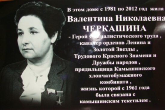 4 сентября 2012 года в городе Камышин Волгоградской области на доме где жила В.Н. Черкашина установлена мемориальная доска.