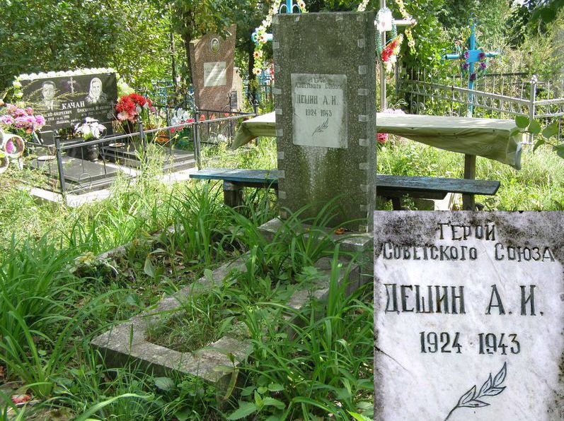 Старший телефонист 6-го артиллерийского полка комсомолец ефрейтор А.И. Дешин отличился в сентябре 1943 года при форсировании реки Десна. Получив приказ проложить через реку кабель и не найдя переправочных средств, обвязал кабель вокруг тела, под огнём противника вплавь достиг правого берега и выполнил боевую задачу.