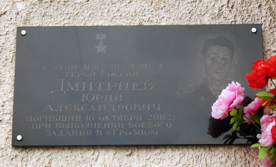 За мужество и героизм, проявленные при выполнении воинского долга в Северо-Кавказском регионе, Указом Президента Российской Федерации от 1 февраля 2005 года капитану Дмитриеву Юрию Александровичу присвоено звание Героя Российской Федерации (посмертно).