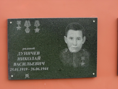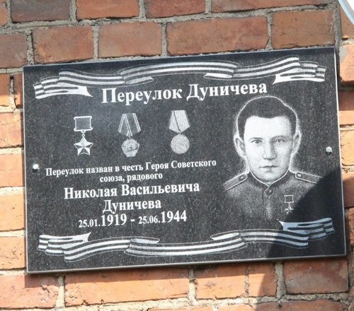 Разведчик взвода пешей разведки 334-го стрелкового полка (47-я стрелковая дивизия, 22-й гвардейский стрелковый корпус, 6-я гвардейская армия, 1-й Прибалтийский фронт) красноармеец Дуничев Николай Васильевич отличился в Витебско-Оршанской фронтовой операции – составной части Белорусской стратегической наступательной операции. 25 июня 1944 года в составе разведгруппы двигался на запад впереди основных сил советских войск в районе деревни Захаровка Шумилинского района Витебской области Белорусской ССР. Обнаружил поставленное в засаде и замаскированное немецкое штурмовое орудие «фердинанд» на перекрёстке автомобильных дорог. Орудие прикрывалось группой автоматчиков. Скрытно приблизившись к противнику, внезапным автоматным огнём уничтожил 7 немецких солдат, в том числе и находившийся снаружи экипаж штурмового орудия. Затем прорвался к «фердинанду» и уничтожил его противотанковой гранатой. В этом бою погиб смертью храбрых***. Своим подвигом обеспечил успешное продвижение наступавших войск.
