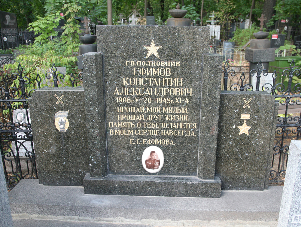 Примечание: Эта дата рождения указана в учётно-послужной карте К.А.Ефимова, хранящейся в ЦАМО РФ. На надгробном памятнике выбита иная дата рождения – 20 мая 1906 года.