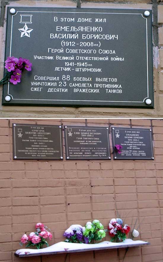 В городе Москва на доме, где жил Герой, установлена мемориальная доска. Сочинение: В военном воздухе суровом... М., 1985.