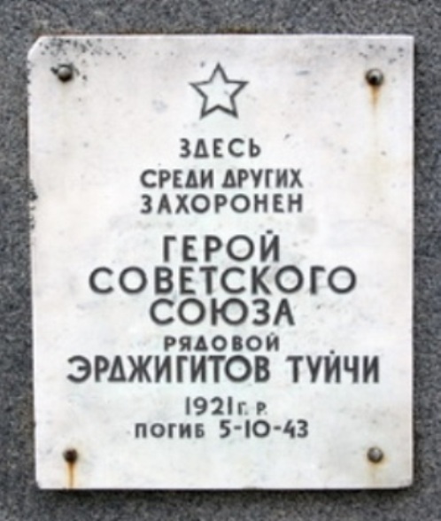 Автоматчик 1064-го стрелкового полка (281-я стрелковая дивизия, 54-я армия, Волховский фронт) комсомолец красноармеец Туйчи Эрджигитов во время боя 5 октября 1943 года в районе деревни Смердыня Тосненского района Ленинградской области закрыл собой амбразуру вражеского дзота, мешавшего наступлению роты. Воодушевленные подвигом товарища, бойцы поднялись в атаку и ворвались в траншею противника. Отважный сын таджикского народа похоронен в братской могиле в городе Любань Ленинградской области.