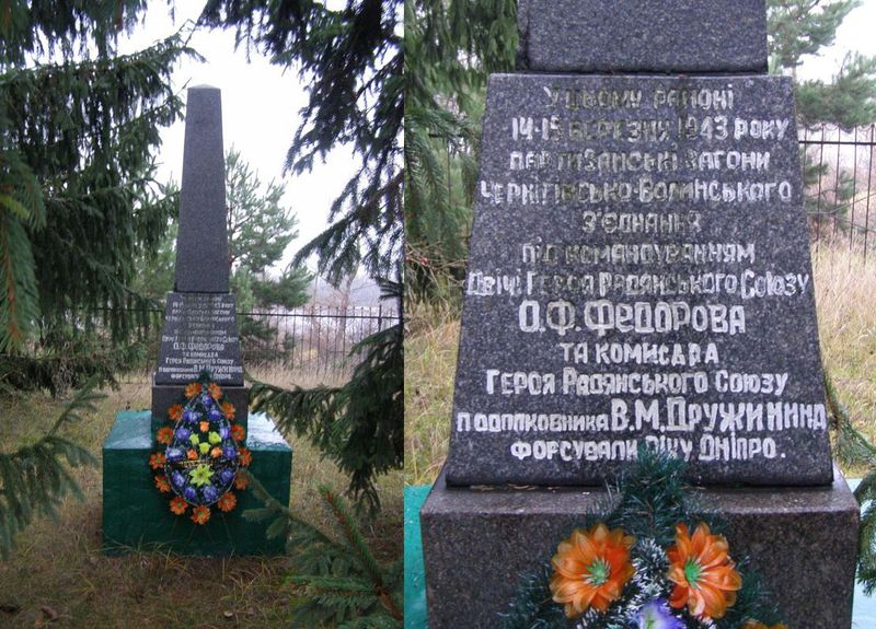 Установлен в селе Каменка Репкинского района Черниговской области (Украина) на месте переправы соединения А.Ф.Федорова через Днепр. Открыт в 1985 году. Фото Олега Кожухаря, 3.11.2013.