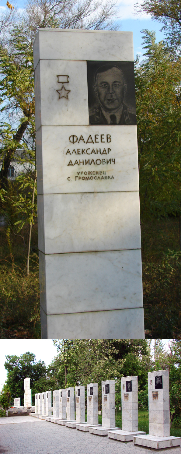 Именем Героя названа улица в селе Громославка. В Волгограде на доме, где жил А.Д.Фадеев (улица Мира, 24) установлена мемориальная доска. Его имя увековечено на мемориале в поселке Октябрьский Волгоградской области.