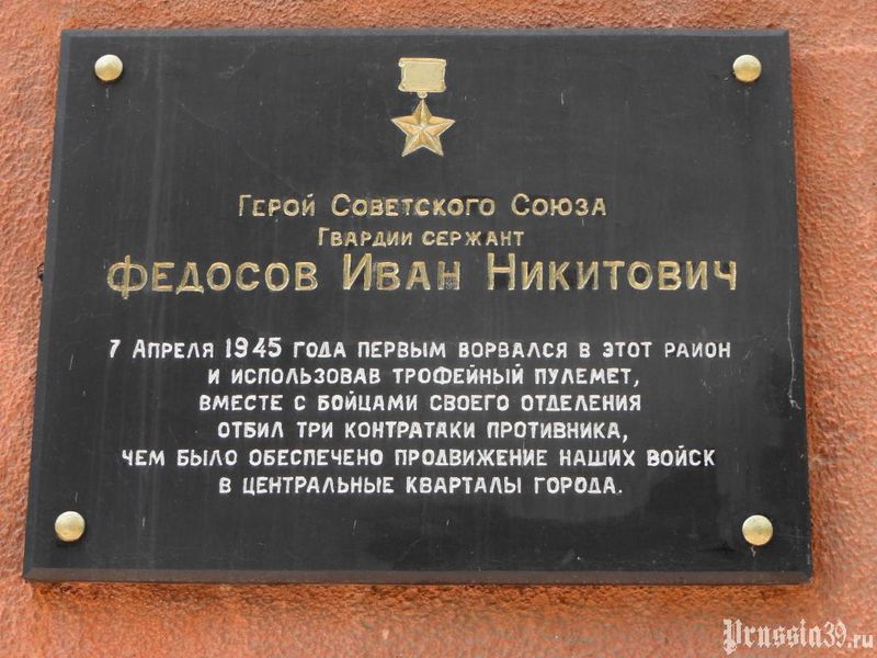 «Отделение т. ФЕДОСОВА входило в штурмовые группы при прорыве укреплений и штурме города КЕНИГСБЕРГ. Действовали штурмовые группы в районе выс. 36,0 и г.дв. ВАЛЬДБЕРГ, где находился сильный форт противника, прикрывавший подступы к городу с северо-запада. 6.4.45 г. под сильным огнем противника т.ФЕДОСОВ проделал проходы в минных и проволочных заграждениях противника, с тремя бойцами скрытно подполз к немецкому ДОТу, который прикрывал подступы к форту, заложил фугас и взорвал вражеский ДОТ вместе в его гарнизоном. Тем самым пехота получила возможность устремиться вперед и обойти форт с тыла. Немцы неоднократно пытались контратаковать штурмовую группу, но, неся большие потери, теряли одну траншею за другой. Видя, что наши части обошли форт, нанося немцам большие потери, гарнизон форта капитулировал. Продолжая наступление, ФЕДОСОВ со своей группой на плечах немцев ворвался в г.дв. РАТСХОФ. Немцы три раза контратаковали штурмовую группу, когда боеприпасы были на исходе, т. ФЕДОСОВ, используя трофейное оружие, продолжал расстреливать гитлеровцев и забрасывать их гранатами. В этом бою немцы оставили перед нашими траншеями более 75 трупов. На окраинах города со своей группой ввзорвал 2 дома, в которых засели гитлеровцы и препятствовали продвижению наших частей. В этих боях группа во главе с ФЕДОСОВЫМ уничтожила более 100 немецких солдат и офицеров и 60 взяла в плен, захватила крупный склад боеприпасов.
