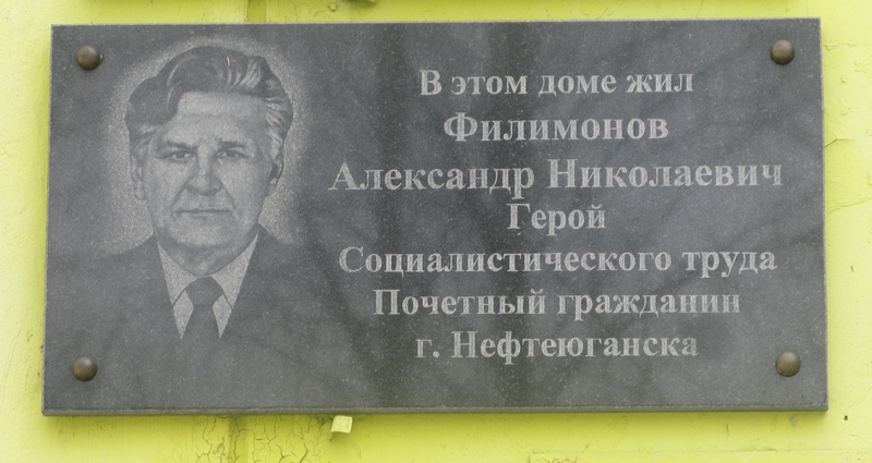 Установлена в городе Нефтеюганск (Ханты-Мансийский автономный округ - Югра) на доме (3 микрорайон, 15), в котором жил А.Н.Филимонов. Фото Владимира Рогова, 18.04.2010.