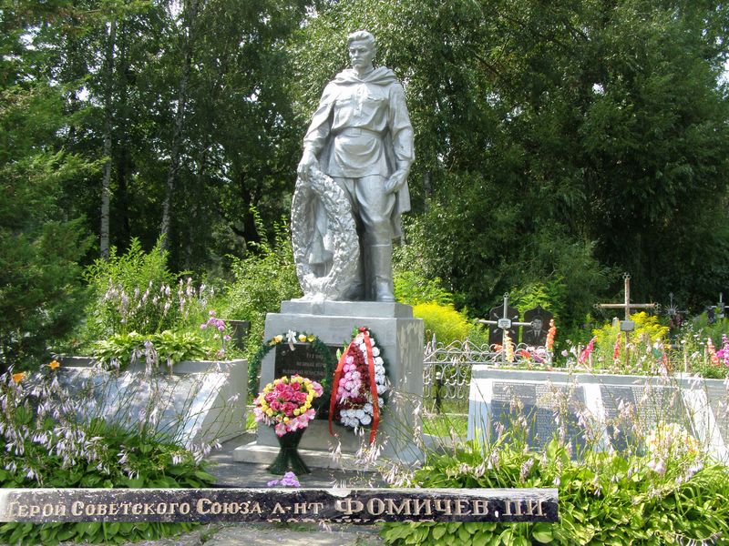 Смертельно раненный лейтенант П.И. Фомичёв упал, но самоходка жила. Место командира занял заряжающий. Он посылал бронебойные снаряды в танки с чёрными крестами, ползающие вокруг станции, огнём с места поддерживал свои подразделения. Стемнело. Бой у Попельни утих. Отошли танки и пехота противника. Воины выдержали бой, не оставили своих позиций. Лейтенанта Петра Ильича Фомичёва похоронили в городе Фастов Киевской области.