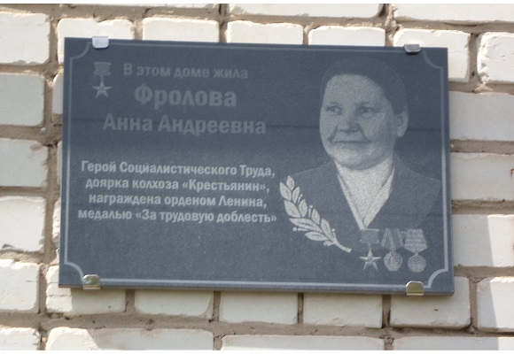 Указом Президиума Верховного Совета СССР от 2сентября 1950 года за достижение высоких показателей в животноводстве в 1949 году, когда ею было получено от 8 коров по 196 килограммов молочного жира в среднем от коровы за год доярка Фролова Анна Андреевна была удостоена звания Героя Социалистического труда с вручением ордена Ленина и золотой медали «Серп и Молот» (№5369).