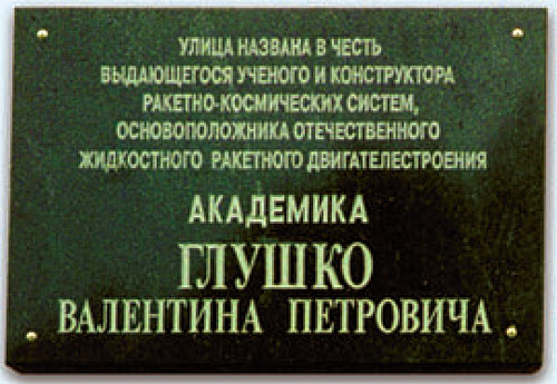 Бронзовые бюсты В.П.Глушко установлены в Одессе и Байконуре, памятник – в Москве и Химках. Мемориальные доски установлены: в Москве и Одессе на домах, в которых жил В.П.Глушко, а также в Королёве на здании, в котором он работал.