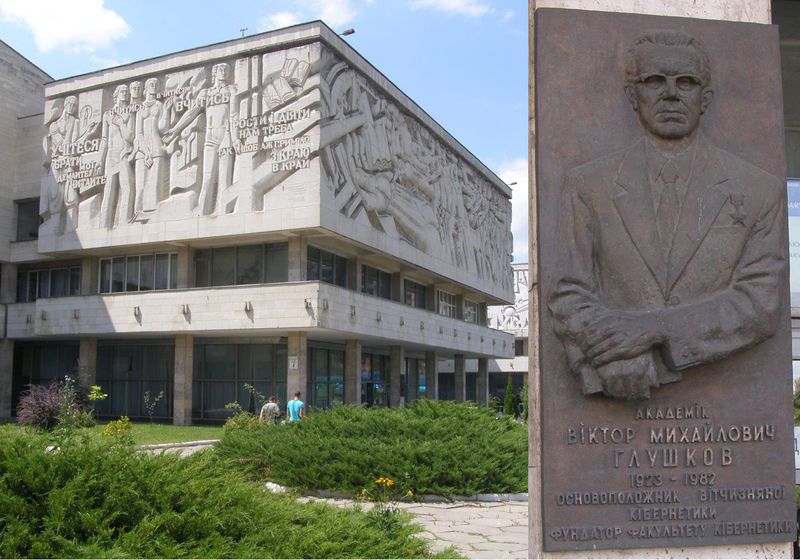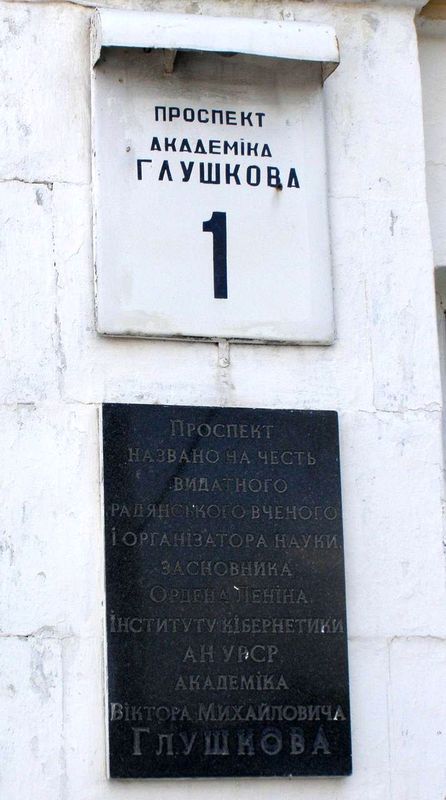 Установлена в Киеве (Украина) на доме (улица Ярославов Вал, 15а), в котором в 1972-1982 годах жил В.М.Глушков. Скульптор В.М.Клоков, архитектор Ф.И.Юрьев. Открыта в 1983 году. Фото Олега Кожухаря, 15.07.2009.