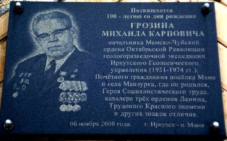 Грозин Михаил Карпович - начальник Мамско-Чуйской комплексной геологоразведочной экспедиции Иркутского геологического управления Министерства геологии РСФСР, Иркутская область.