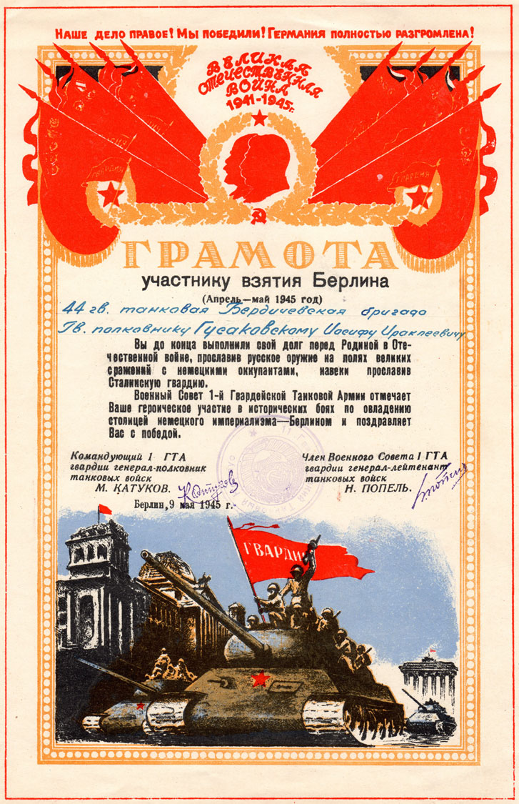 Гусаковский Иосиф Ираклиевич – командир 44-й гвардейской Бердичевской Краснознамённой орденов Суворова 2-й степени, Кутузова 2-й степени, Богдана Хмельницкого 2-й степени, Красной Звезды, Сухэ-Батора и Красного Знамени Монгольской Народной Республики танковой бригады «Революционная Монголия» 11-го гвардейского Прикарпатско-Берлинского Краснознамённого ордена Суворова 2 степени танкового корпуса 1-й гвардейской танковой армии 1-го Украинского фронта; 1-го Белорусского фронта; гвардии полковник.