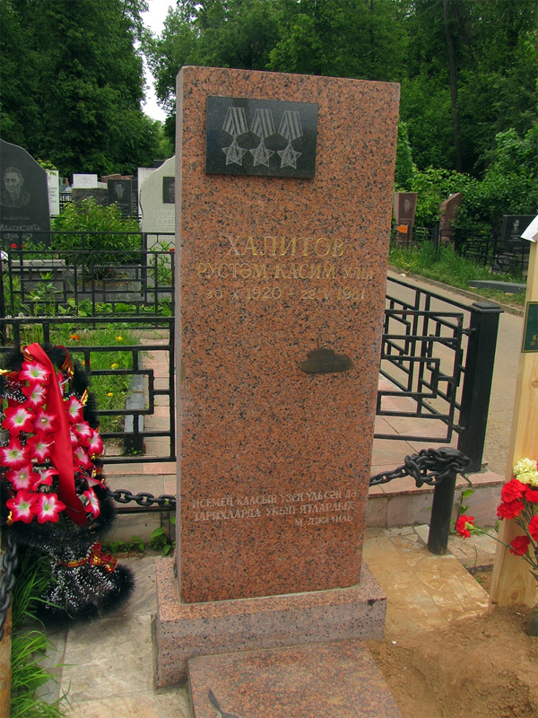 Механик-водитель танка 37-й гвардейской танковой бригады (2-й гвардейский механизированный корпус, 46-я армия, 2-й Украинский фронт) гвардии старшина Рустэм Xалитов в составе экипажа 1 ноября 1944 года в бою в 16 километрах севернее города Кечкемет (Венгрия) огнем и гусеницами танка поразил две пушки с тягачами, штабной автобус, свыше десяти гитлеровцев.