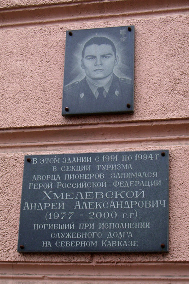Установлена на здании Курского городского дворца пионеров и школьников (улица Ленина, дом 43). В 1991-1994 годах А.А.Хмелевской занимался в Дворце пионеров в секции туризма. Фото А.А.Симонова, 30.08.2007.
