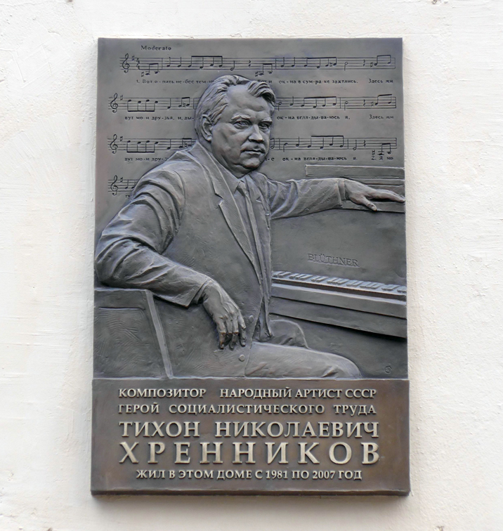 Установлена в Москве (Плотников переулок, дом 10) на доме, в котором в 1981-2007 годах жил Т.Н.Хренников. Скульптор А.Забалуев, архитектор М.Корси. Открыта 13 апреля 2015 года. Фото Станислава Лебедева, 21.04.2015.