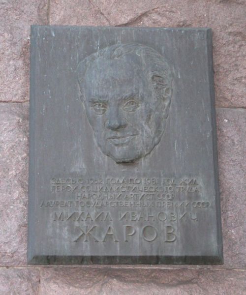 Установлена в Москве на доме, где в 1952-1981 годах жил М.И.Жаров (Котельническая набережная, 1/15). Фото В.Б.Лушпая (Москва), 2010.