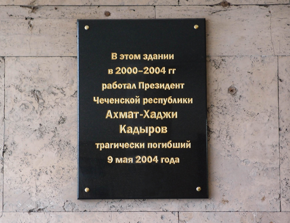 Установлена в Москве (улица Новый Арбат, дом 19) на доме, в котором в 2000-2004 годах работал А.А.Кадыров (в этом здании расположено Представительство Чеченской Республики при Президенте РФ). Открыта 23 августа 2004 года. Фото Станислава Лебедева, 30.12.2013.