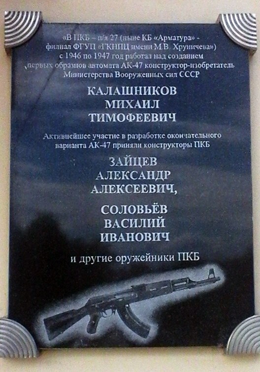 В 1944 году М.Т.Калашников разработал образец самозарядного карабина, устройство основных узлов которого послужило базой для создания автомата в 1946 году. В 1947 году изобретатель усовершенствовал свой автомат и одержал победу в конкурсных испытаниях. После доработки, автомат в 1949 году был принят на вооружение Советской Армии под названием «7,62-мм автомат Калашникова образца 1947 года» (АК). В 1949 году М.Т.Калашников был удостоен Сталинской премии 1-й степени.