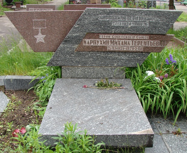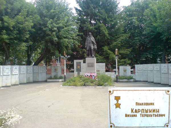 В Киеве, у подножия монумента Родина-мать, перечислены фамилии Героев Советского Союза, которые освобождали Украину. Среди них есть и фамилия Карпухина М.Т.