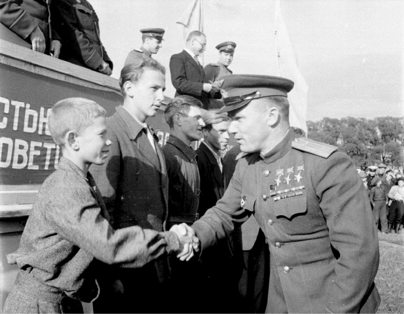 Кожедуб Иван Никитович - командир эскадрильи 240-го истребительного авиационного полка (302-я истребительная авиационная дивизия, 5-я воздушная армия, Степной фронт); заместитель командира 176-го гвардейского истребительного авиационного полка (302-я истребительная авиационная дивизия, 16-я воздушная армия, 1-й Белорусский фронт).