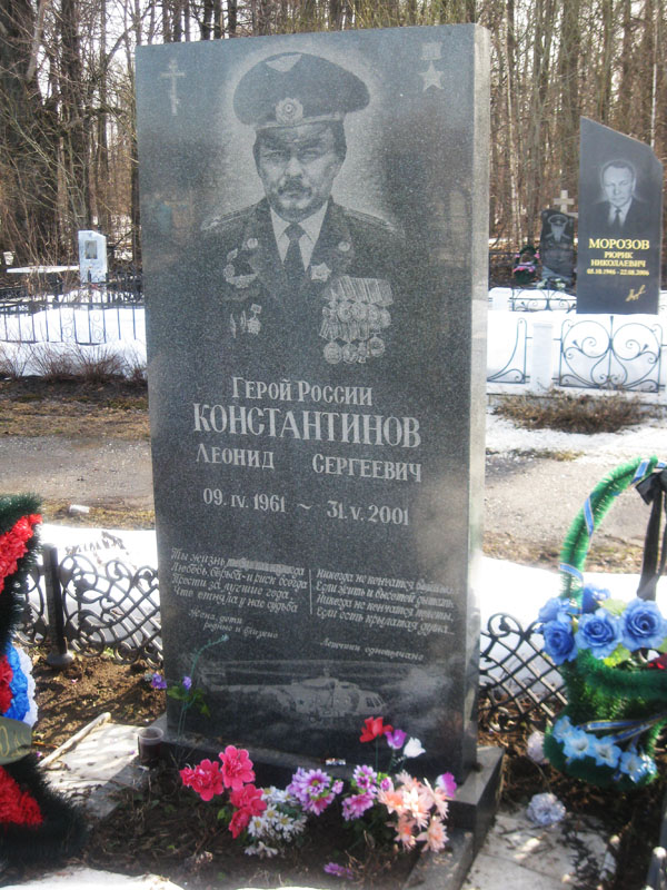 31 мая 2001 года Леонид Константинов пилотировал вертолет Ми-8, на борту которого находились группа инспекторов Федеральной пограничной службы РФ и два депутата Государственной Думы РФ. После завершения инспекционной поездки машина возвращалась на базу. Над территорией Республики Ингушетия в районе станицы Нестеровская вертолет внезапно был обстрелян с земли из крупнокалиберного пулемета. Подполковник Константинов получил 6 пулевых ранений в живот, грудь и в голову, но сумел удержать управление вертолетом и вывел его из зоны огня. Своими мужественными действиями он спас жизнь всем находившимся на борту людям. Когда командир вертолета потерял сознание от тяжелых ранений, его заменили остальные члены экипажа, которые произвели посадку поврежденного вертолета в поле. Однако от тяжелых ранений и большой потери крови Леонид Константинов скончался до эвакуации в госпиталь...