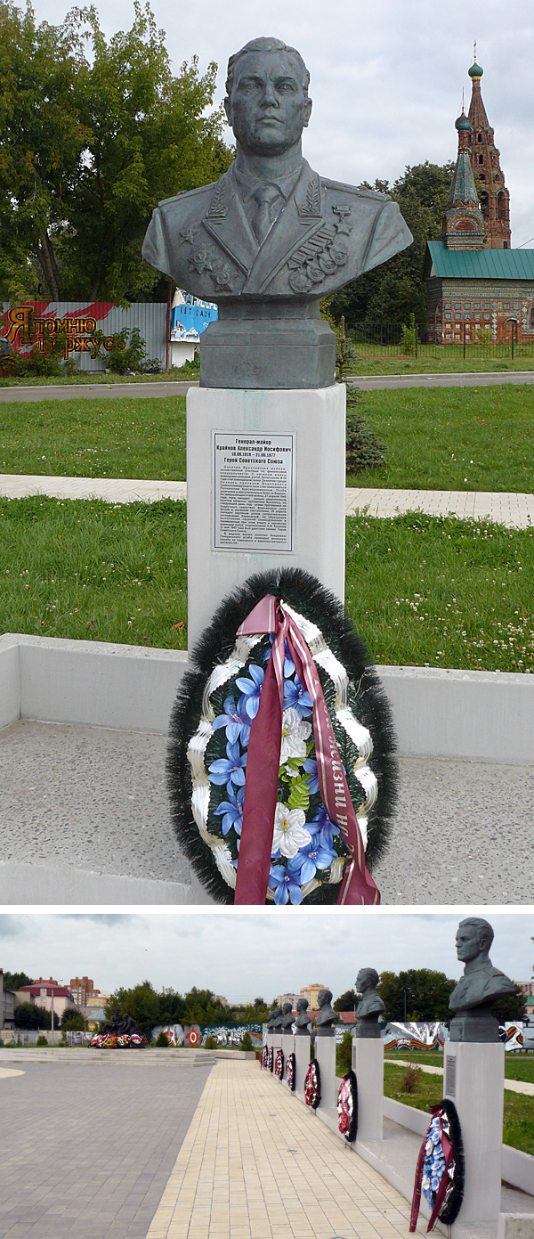 В городе Владимире на мемориале на площади Поьеды установлена стела с барельефом Героя.В городе Ярославль на мемориале военным финансистам установлен бюст Героя.>