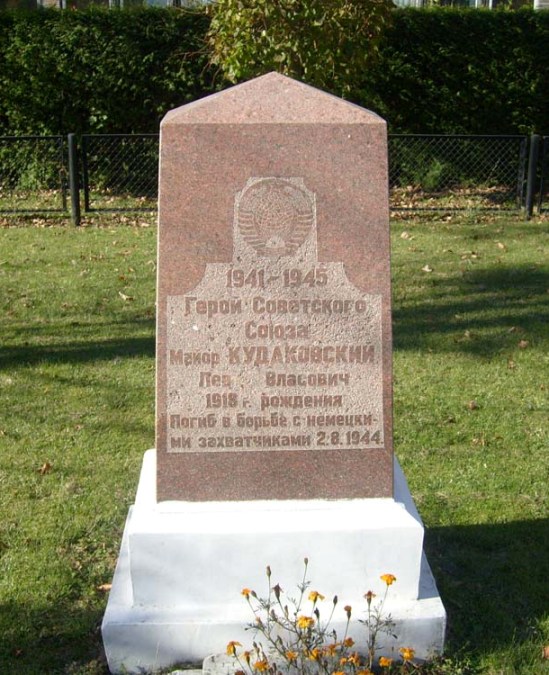 Командир батальона 992-го стрелкового полка (306-я стрелковая дивизия, 43-я армия, 1-й Прибалтийский фронт) майор Л.В.Кудаковский 24 июня 1944 года в числе первых переправился через реку Западная Двина у деревни Шарипино Бешенковичского района Витебской области (Белоруссия), затем организовал переправу батальона.