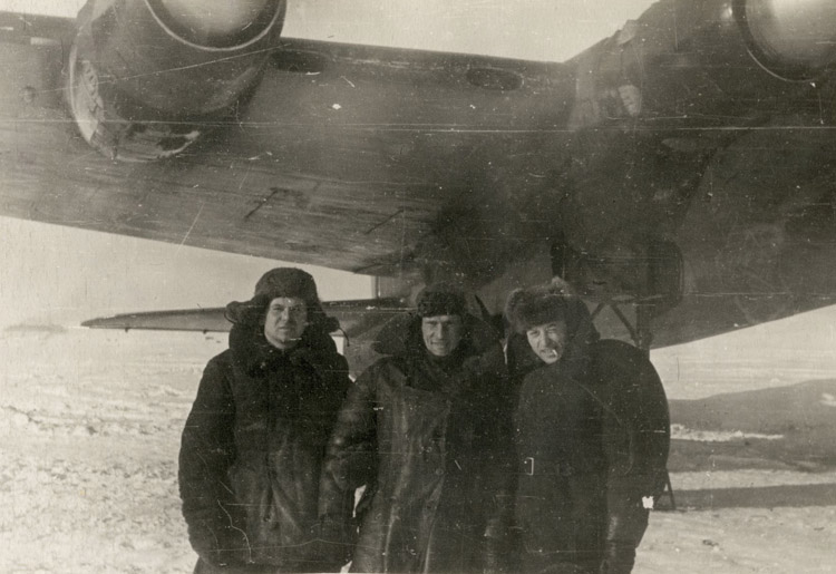 слева направо бортмеханики В. Водопьянов и В.Троицкий, бортрадист О.Куксин.