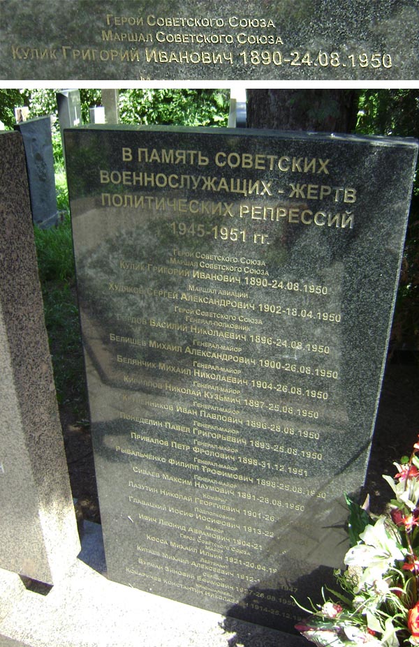 По приговору Военной коллегии Верховного Суда СССР от 23 августа 1950 года Г.И. Кулик расстрелян 24 августа 1950 года. Тело захоронено на территории Донского кладбища Москвы. В память об этом на участке № 3 установлен памятник жертвам политических репрессий, на котором выбито имя Г.И.Кулика.